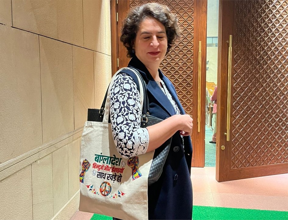 नई दिल्ली। कांग्रेस सांसद प्रियंका गांधी वाड्रा सोमवार को फिलिस्तीन लिखा बैग लेकर संसद पहुंची थीं। उन्होंने फिलिस्तीनियों के प्रति अपना समर्थन जाहिर किया था। इस मामले में भाजपा द्वारा घेरे जाने के बाद अब प्रियंका ने बांग्लादेश वाला दांव चल दिया है। दरअसल वायनाड से नव निर्वाचित सांसद प्रियंका गांधी वाड्रा मंगलवार को संसद पहुंची तो वह बांग्लादेश लिखा हुआ बैग लेकर पहुंची। बैग में बांग्लादेशी हिंदुओं और ईसाइयों साथ खड़े हो लिखा था।