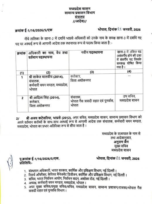 वहीं, निवर्तमान कलेक्टर आदित्य सिंह को भोपाल गैस त्रासदी राहत एवं पुनर्वास विभाग में उपसचिव की जिम्मेदारी सौंपी गई है।