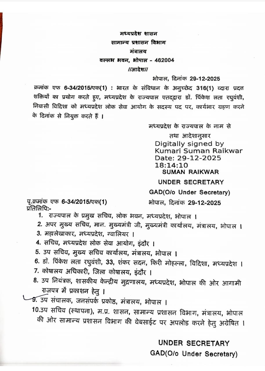 ताज़ा ख़बरप्रमुख़ ख़बरे डॉ. पिंकेश लता रघुवंशी लोक सेवा आयोग के सदस्य पद पर नियुक्त By admin December 30, 2025 0 17 Share FacebookTwitterPinterestWhatsApp प्रमुख खबरे आर्थिक सर्वेक्षण में वित्त मंत्री ने दिया नई टैक्स पॉलिसी का संकेत, अनहैल्दी फूड होंगे महंगे January 29, 2026 स्ट्रीट डॉग के मामले में सुप्रीम कोर्ट ने सुरक्षित रखा फैसला January 29, 2026 आर्थिक सर्वेक्षण:गिग इकॉनामी रोजगार के तेजी से बढ़ते स्त्रोतों में पर जोखिम भी बढ़े January 29, 2026 उद्यमशील राष्ट्र बनाने के लिए ईमानदार अधिकारियों को परेशान करने वाले मुकदमों से बचाना जरूरी January 29, 2026 मध्यप्रदेश शासन ने डॉ. पिंकेश लता रघुवंशी को मध्यप्रदेश लोक सेवा आयोग के सदस्य पद पर नियुक्त करने के आदेश जारी किए हैं। सामान्य प्रशासन विभाग द्वारा जारी आदेश अनुसार विदिशा निवासी डॉ. रघुवंशी की नियुक्ति कार्यभार ग्रहण के दिनांक से मान्य होगी। Share FacebookTwitterPinterestWhatsApp Previous article2026 में होंगी कुल 187 दिन की सरकारी छुट्टियां, जीएडी से जारी हुई सूचीNext articleएशिया पावर इंडेक्स 2025 में भारत की रक्षा ताकत का लोहा माना गया - Advertisement - More articles आर्थिक सर्वेक्षण में वित्त मंत्री ने दिया नई टैक्स पॉलिसी का संकेत, अनहैल्दी फूड होंगे महंगे January 29, 2026 स्ट्रीट डॉग के मामले में सुप्रीम कोर्ट ने सुरक्षित रखा फैसला January 29, 2026 आर्थिक सर्वेक्षण:गिग इकॉनामी रोजगार के तेजी से बढ़ते स्त्रोतों में पर जोखिम भी बढ़े January 29, 2026 LEAVE A REPLY Cancel reply Comment: Please enter your comment! Name:* Please enter your name here Email:* You have entered an incorrect email address! Please enter your email address here Website: Save my name, email, and website in this browser for the next time I comment. - Advertisement - ताज़ा खबरे आर्थिक सर्वेक्षण में वित्त मंत्री ने दिया नई टैक्स पॉलिसी का संकेत, अनहैल्दी फूड होंगे महंगे January 29, 2026 स्ट्रीट डॉग के मामले में सुप्रीम कोर्ट ने सुरक्षित रखा फैसला January 29, 2026 आर्थिक सर्वेक्षण:गिग इकॉनामी रोजगार के तेजी से बढ़ते स्त्रोतों में पर जोखिम भी बढ़े January 29, 2026 उद्यमशील राष्ट्र बनाने के लिए ईमानदार अधिकारियों को परेशान करने वाले मुकदमों से बचाना जरूरी January 29, 2026 सुप्रीम कोर्ट ने यूजीसी के नए नियमों पर लगाई रोक January 29, 2026