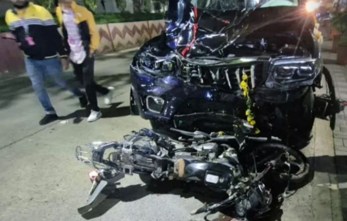 कार की टक्कर इतनी जोरदार थी कि छात्रों की बाइक 80–90 फीट दूर जा गिरी और कार का आगे का हिस्सा पूरी तरह क्षतिग्रस्त हो गया।