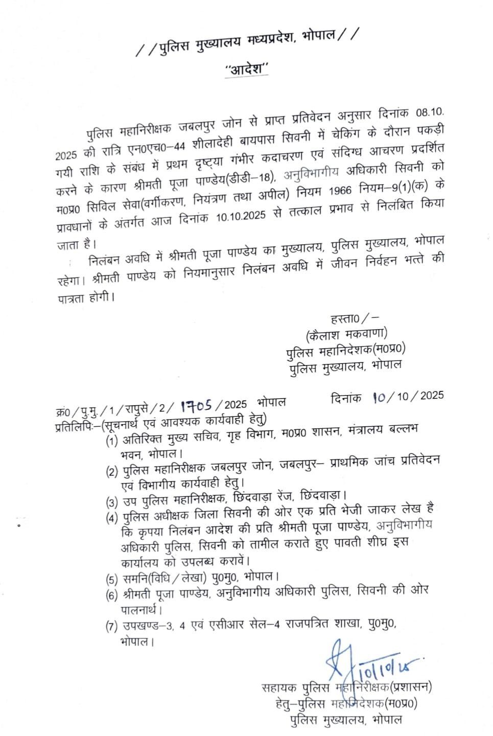 इस मामले के तूल पकड़ते ही पुलिस मुख्यालय ने कमान संभाली। DGP कैलाश मकवाना ने सख्ती दिखाते हुए SDOP पूजा पांडे के खिलाफ निलंबन का आदेश जारी कर दिया। आदेश में स्पष्ट लिखा है: “8 अक्टूबर 2025 को NH-44 शीलादेही बायपास सिवनी में चेकिंग के दौरान बरामद राशि से जुड़े गंभीर कदाचार और प्रथम दृष्टया संदिग्ध व्यवहार के कारण तत्काल निलंबित किया जाता है।