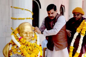 भोपाल। संविधान निर्माता डॉ. भीमराव अंबेडकर की आज जन्म जयंती है। इस मौके पर मुख्यमंत्री डॉ. मोहन यादव सोमवार को भीम जन्मस्थली (महू) डॉ. अंबेडकर नगर पहुंचे और संविधान निर्माता को पुष्पांजलि अर्पित की। इस दौरान सीएम मोहन ने एक बड़ा ऐलान भी किया। उन्होंने घोषणा की है कि भीम जन्मस्थली महू में धर्मशाला निर्माण के लिए सरकार द्वारा 3.5 तीन एकड़ जमीन उपलब्ध कराई जाएगी। साथ महू आने-जाने वालों की संपूर्ण सुविधा का प्रबंध सरकार की ओर से किया जाएगा। कार्यक्रम में केंद्रीय मंत्री सावित्री ठाकुर, सांसद कविता पाटीदार, पूर्व मंत्री और विधायक ऊषा ठाकुर सहित वरिष्ठ पदाधिकारी उपस्थित थे।